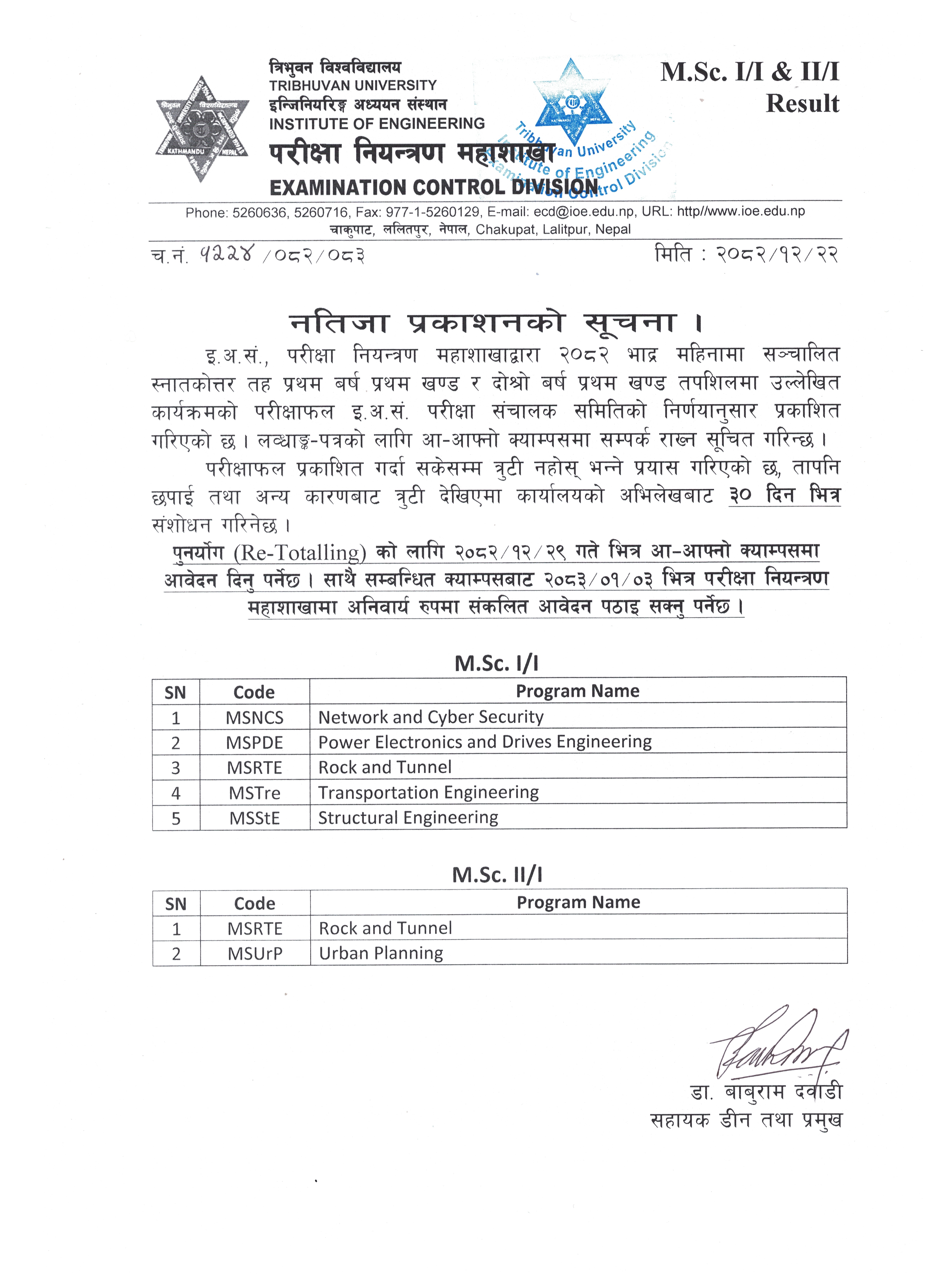 It is with a deep sense of responsibility and commitment that I extend my sincere greetings to all faculty members, staffs and students of the Institute of Engineering (IOE), Tribhuvan University. I am honored to inform you that I have been taking the main responsibility as an Asst. Dean (Administration) at IOE, while I have recently assumed the additional role of Chief of the Examination Control Division of the IOE. I take this opportunity to express my gratitude to... ... ...
