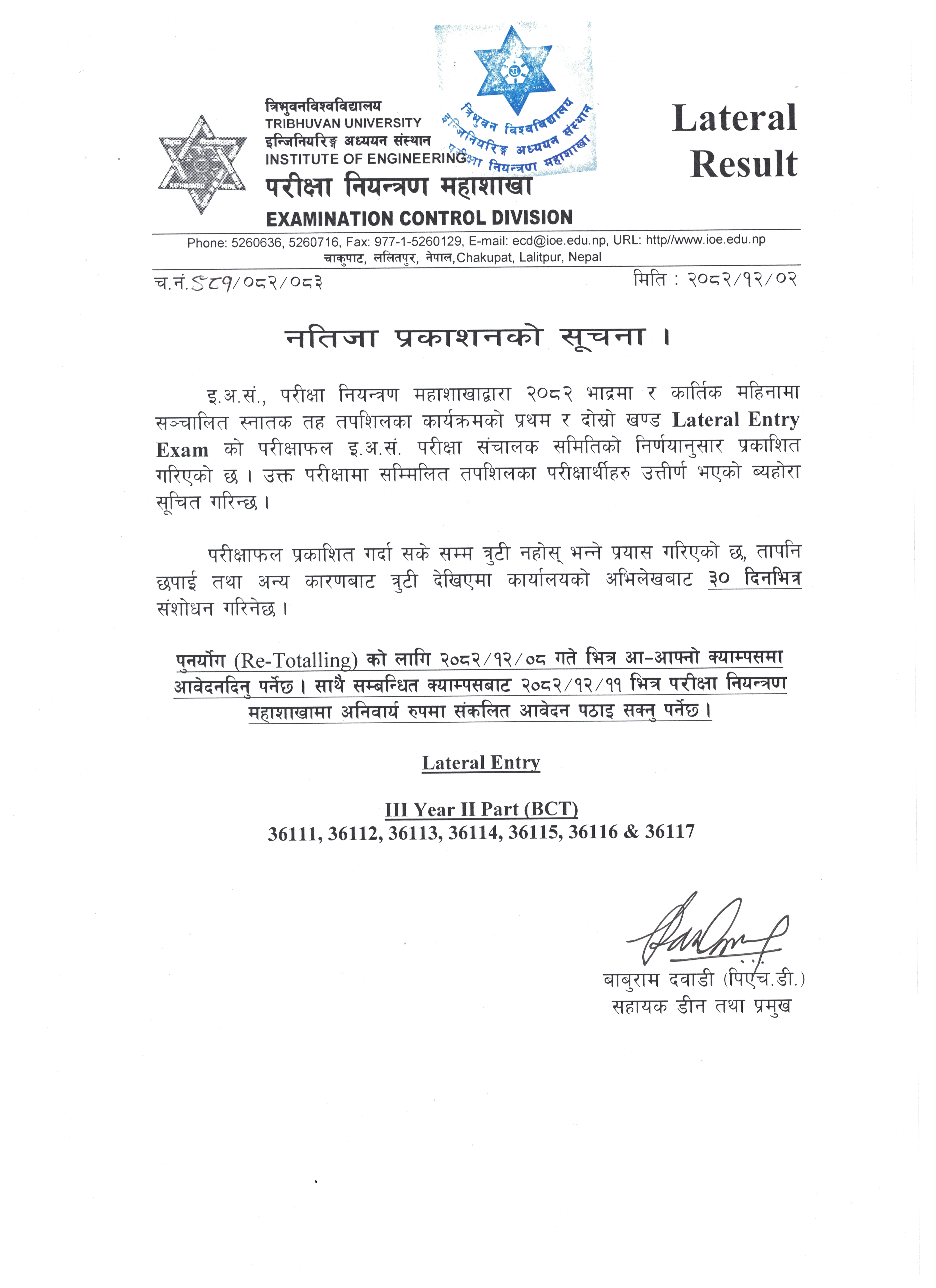 Result BE/BAR Third Year First Part 2082 Bhadra (Regular/ Back)