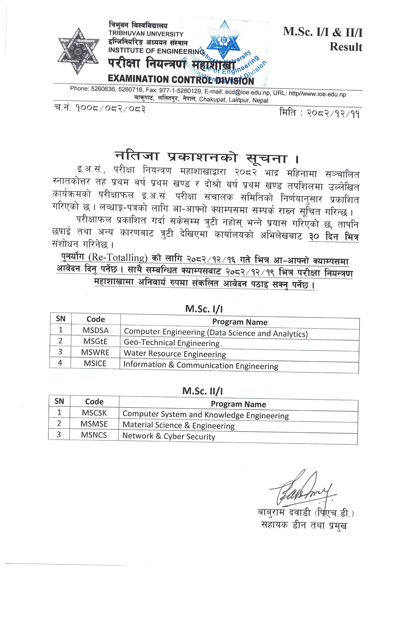 Retotalling Result BE BAR II Year I Part (New Course) 2082 Back